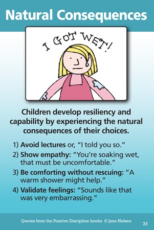 A natural consequence is anything that happens naturally, with no adult interference. When you stand in the rain, you get wet. When you don’t eat, you get hungry. When you forget your coat, you get cold. No piggy backing allowed. Adults piggy back when they lecture, scold, say, “I told you so,” or do anything that adds more blame, shame, or pain than the child might experience naturally from the experience.