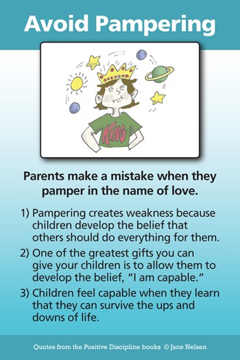 Parents make a mistake when they pamper in the name of love. Pampering creates weakness because children develop the belief that others should do everything for them. One of the greatest gifts you can give your children is to allow them to develop the belief, “I am capable.” Children feel capable when they learn that they can survive the ups and downs of life.
